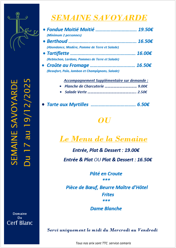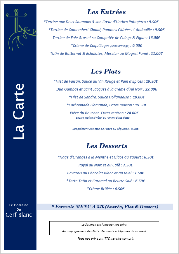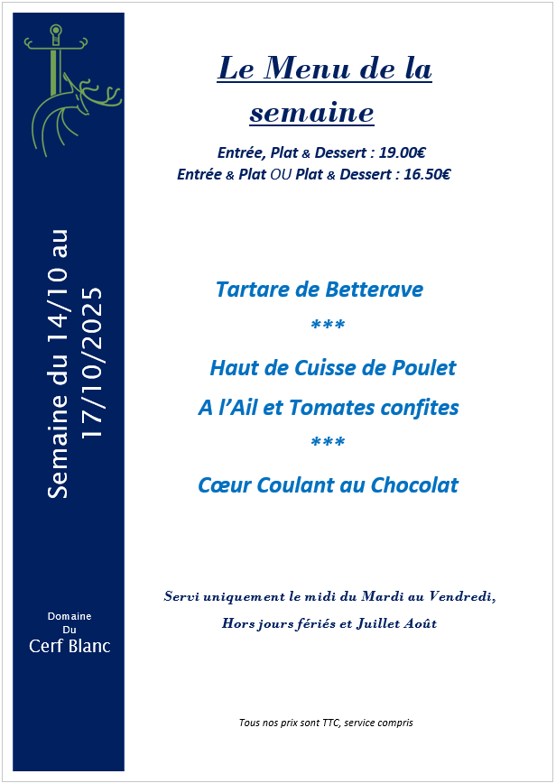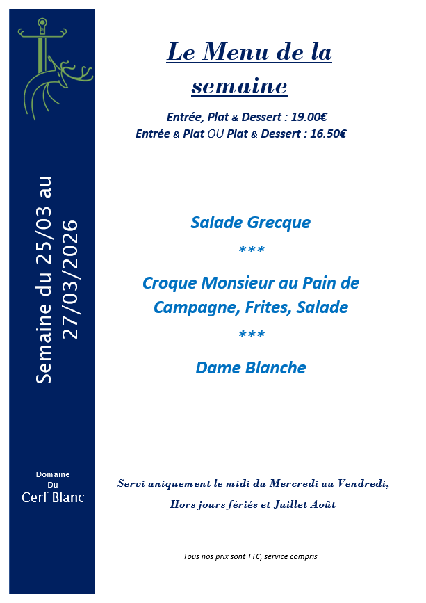 Le cadre du Domaine du Cerf Blanc et les plats savoureux vous feront passer un excellent moment en notre compagnie. Nous vous proposons plusieurs menus ainsi que des menus de groupes et de banquets.