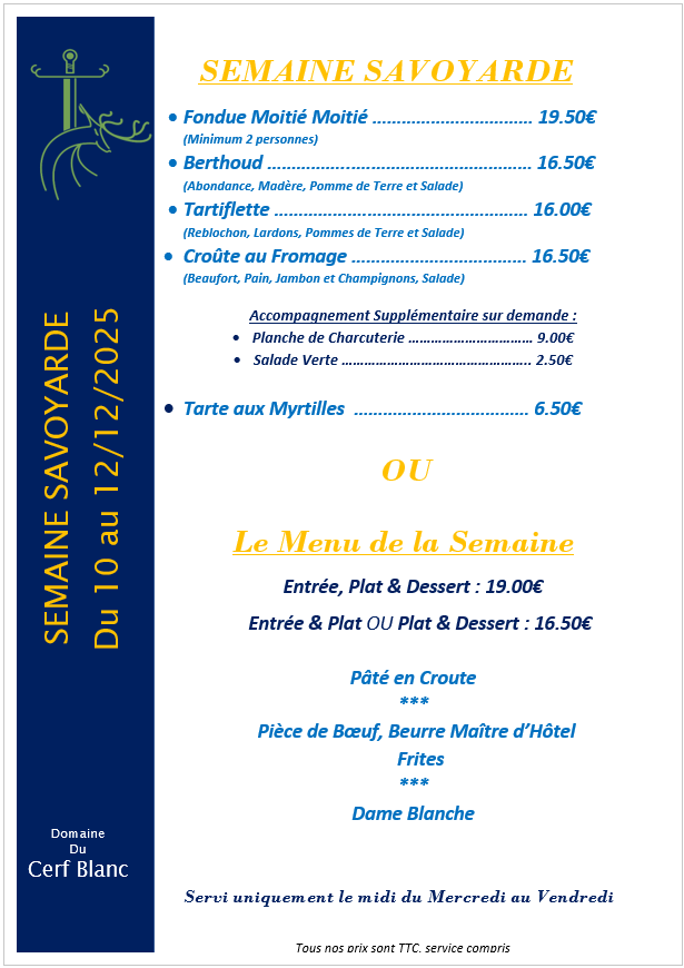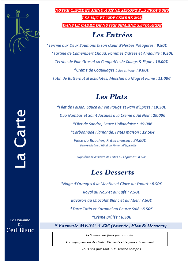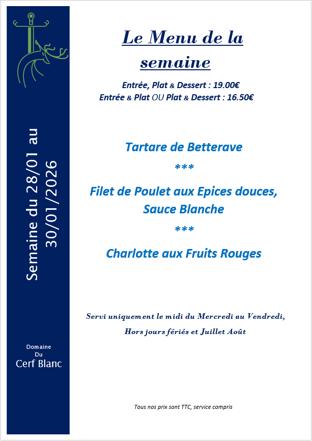Le cadre du Domaine du Cerf Blanc et les plats savoureux vous feront passer un excellent moment en notre compagnie. Nous vous proposons plusieurs menus ainsi que des menus de groupes et de banquets.